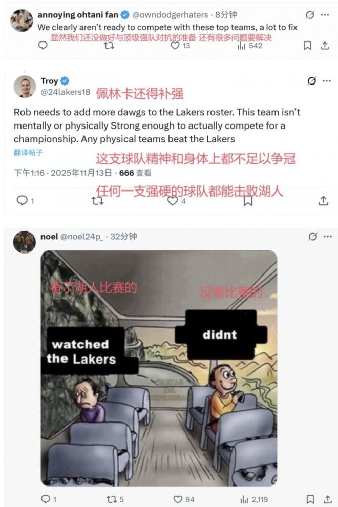 還有美國球迷就直說了:“沒有詹姆斯的時候,任何一支球隊都能戰勝湖人隊,不管你是否承認,詹姆斯仍然是這支球隊防守最好,能力最強的人。”、“事實證明,湖人圍繞著東契奇建隊是最差的決定,沒有任何一個球隊能圍著一個刷子拿到總冠軍。”
