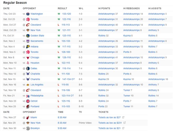 字母哥缺席後雄鹿是一波三連敗,本賽季字母哥缺席的五場是1勝4負(隻擊敗了勇士),這一波五連敗分別不敵:湖人、騎士、費城、活塞、開拓者,沒有揚尼斯的雄鹿的確太次。