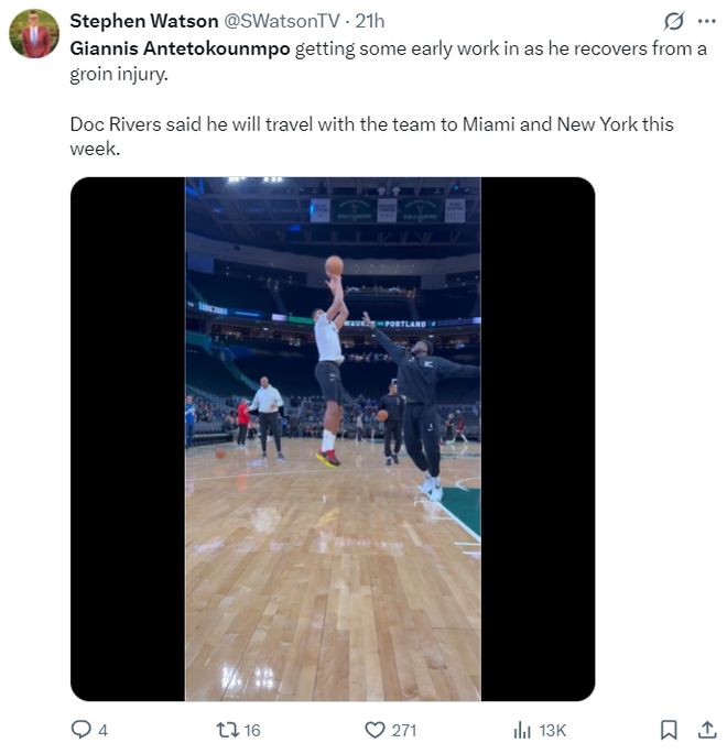 根據道格-裏夫斯的說法,揚尼斯在腹股溝受傷的初期就已經開始恢複日常訓練,接下來雄鹿的客場之旅(熱火、尼克斯)字母哥也會隨隊,根據Shams的報道揚尼斯是腹股溝一級拉傷,恢複時間是1-2周。