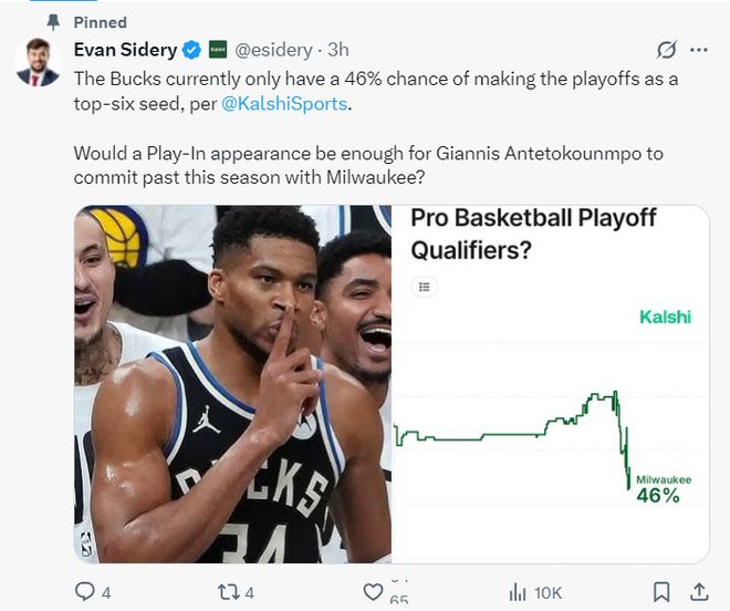 北京時間11月26日淩晨,埃文-斯迪瑞再度發文,根據KalshiSports 的數據。目前排名東部第九的雄鹿進入東部前六的概率隻有46%(不打附加賽)。如果揚尼斯在季後賽中再登場一次這是否足以讓他決定留守密爾沃基呢?